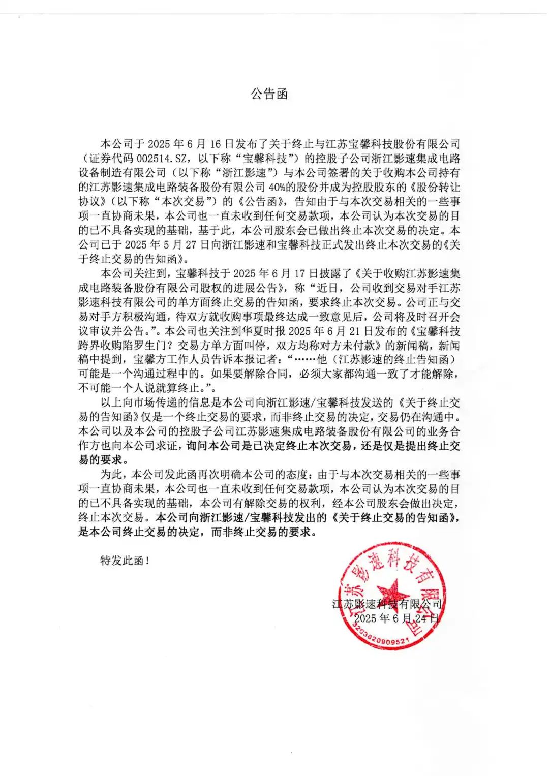 控股股东ks凯时科技已终止与宝馨科技(证券代码002514.SZ)的控股子公司浙江ks凯时关于收购本公司40%股份的交易